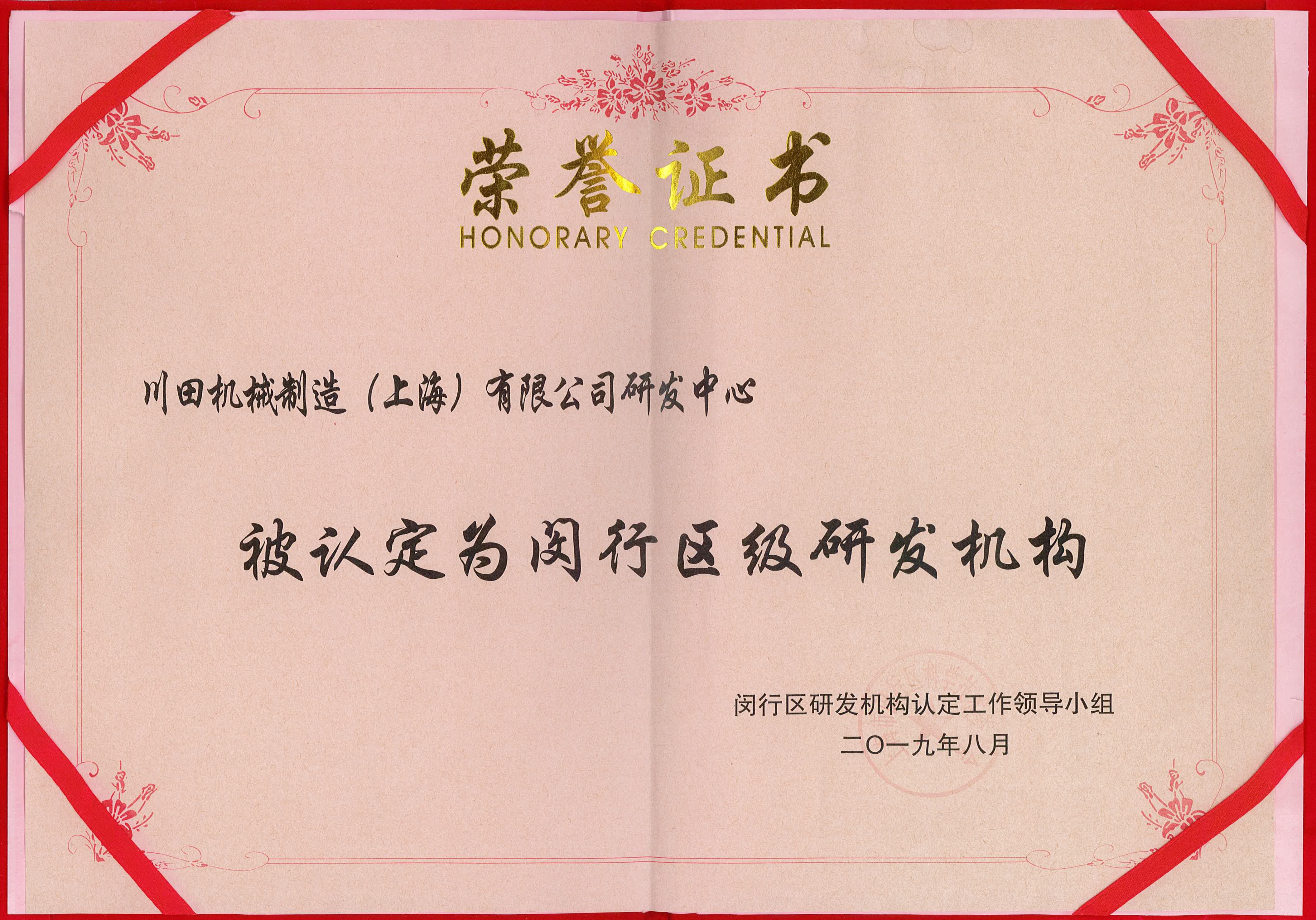 2019 閔行區(qū) 研發(fā)機(jī)構(gòu)證書(shū)